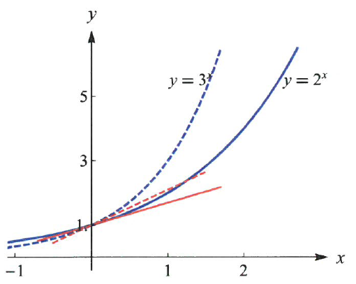 $$L_2=\lim_{h\rightarrow0}\frac{2^h-1}{h}\approx0.69,\quad L_{2.5}=\lim_{h\rightarrow0}\frac{2.5^h-1}{h}\approx0.92,\quad L_3=\lim_{h\rightarrow0}\frac{3^h-1}{h}\approx1.10$$