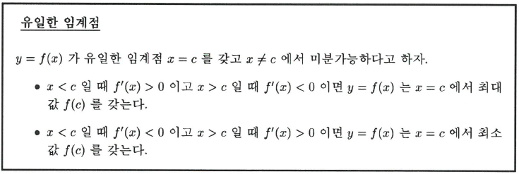 위 문제처럼 함수가 정의된 구간 안에 임계점이 하나만 있는 경우를 살펴보자. $y=f(x)$가 유일한 임계점을 갖고 임계점 왼쪽에서는 증가하고 임계점 오른쪽에서는 감소하면 임계점에서 최대값을 갖는다. 반대로 임계점 왼쪽에서는 감소하고 임계점 오른쪽에서는 증가하면 임계점에서 최소값을 갖는다.