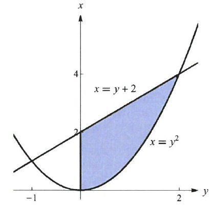 함수를 나타낼 때 우리는 일반적으로 $y=f(x)$로 표시한다. 이때 $x$를 독립변수라고 하고 수평축에, $y$를 종속변수라고 하고 수직축에 나타낸다. 그러나 $x$를 항상 독립변수로 간주해야 할 필요는 없다. $x$를 $y$의 함수로 다루는 것이 더 편할 때에는 $y$를 독립변수로 간주해도 된다. 예를 들어, 두 곡선 $x=y^2, x=y+2$와 $y=0,y=2$로 둘러싸인 영역으로 나타낼 수 있다.