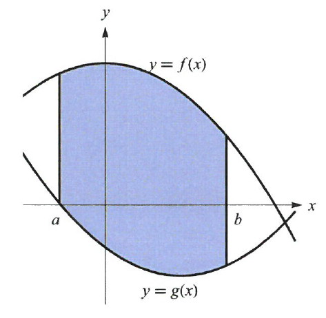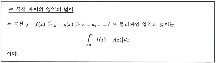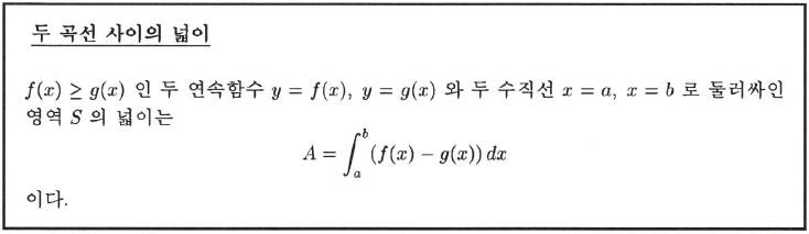 그러므로 구간 $[a,b]$에서 두 곡선 사이의 넓이는 다음과 같이 구할 수 있다.