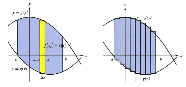 따라서 $n\rightarrow\infty$ 일 때, $f,g$가 연속함수이면 이 극한값이 존재하며 그 극한값을 주어진 영역의 넓이로 정의한다.
