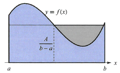 이다. $A$는 또한 밑변이 $(b-a)$이고 높이가 $\frac{A}{b-a}$인 직사각형의 넓이이기도 하다. 여기서 $\frac{A}{b-a}$을 구간 $[a,b]$에서 함수 $y=f(x)$의 평균(average)으로 정의한다.