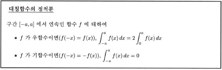 적분구간이 원점에 대하여 대칭인 경우 즉, 적분구간이 $[-a,a]$인 경우 피적분함수의 대칭성을 이용하면 정적분을 간단히 구할 수 있다. 연속함수 $f$에 대하여 정적분의 성질을 사용하면