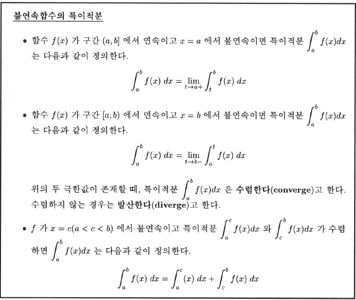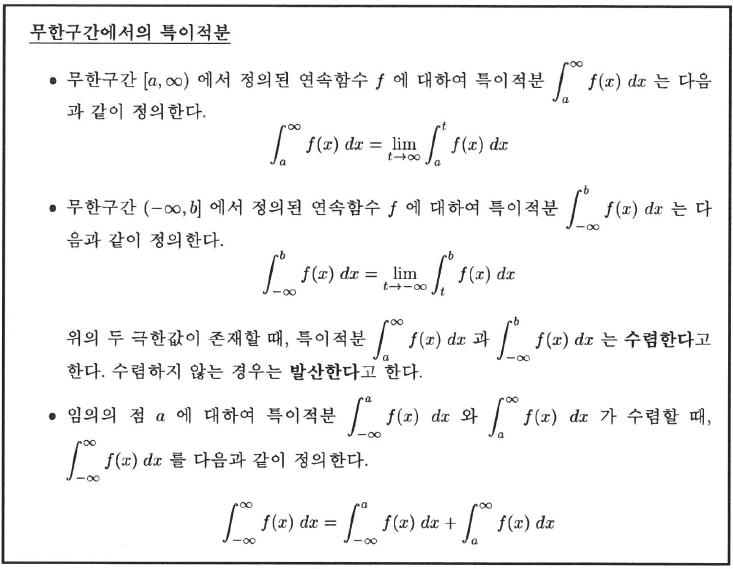 지금까지 우리는 유한한 닫힌 구간 $[a,b]$에서 정의된 연속인 함수 $f$에 대하여 정적분 $\int_{a}^{b} f(x)\;dx$을 정의하였다. 이 절에서는 두 가지 조건 중에서 적어도 하나가 성립하지 않는 경우의 정적분을 정의한다. 이러한 경우의 정적분을 특이적분(improper integral)이라 부른다.