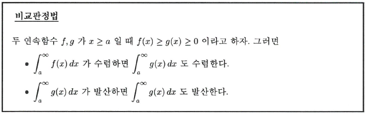 양의 값을 갖는 함수의 적분은 함수의 그래프와 $x$축 사이의 넓이로 이해할 수 있으므로 비교판정법은 작은 함수의 넓이가 큰 함수의 넓이보다 작다는 사실로부터 유추할 수 있다.