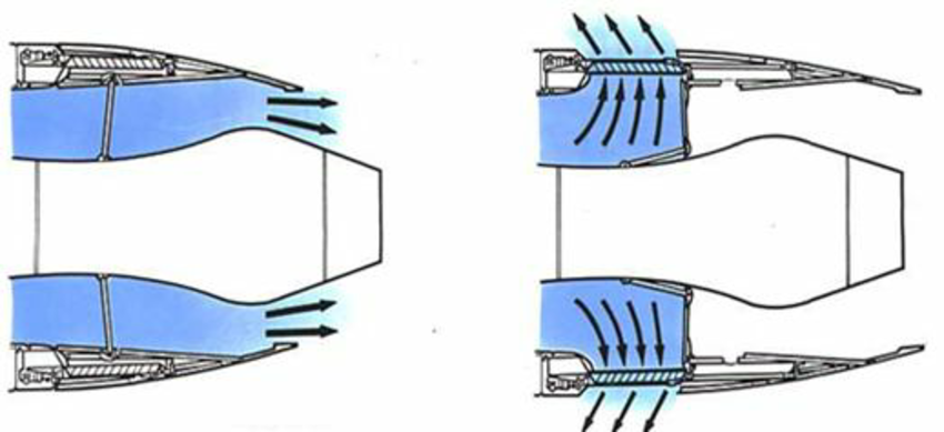 이렇게 이물질로 피해를 입는 것을 FOD(Foreign Object Dagmage)라고 하는데 이것을 막기 위해 Airbus 비행기의 경우 70노트까지 사용하는 제한 사항이 있습니다. 70 노트는 약 시속 100km로 꽤 빠른 속도 같이 느껴지지만 비행기에선 이 정도만 줄여도 브레이크나 다른 장치들로 충분한 감속을 할 수 있습니다. 일원적으로 역추진을 이용해 후진을 할 수 있습니다. 하지만 이러한 방식으로 후진을 하지는 않습니다. 여러 이유가 있지만 두 개만 꼽자면 첫째는 연료소모가 심하고 둘째는 위험하기 때문입니다. 모든 역추진 방식은 분사 방향이 180도가 아닌 사선으로 분사됩니다. 정반대가 아니기 때문에 상당히 비효율적입니다. 캐스케이드 방식만 보더라도 엔진 코어에서 만들어내는 제트는 그대로 뒤로 품어내고 바이패스 에어가 사선으로 역분사 되는 구조입니다.