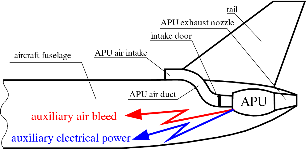 이것의 정체는 보조 동력장치 영어로는 Auxiliary Power Unit, APU라고 합니다. APU는 작은 제트엔진입니다. 하지만 비행기 날개 부착된 엔진과는 달리 APU는 추진력을 생성하지는 않습니다. APU는 지상에서 많이 쓰이는데 보통 날개에 부착된 엔진의 시동이 완료될 때까지 사용합니다. APU는 두 가지의 중요한 역할을 하는데 첫째는 발전기를 통한 전기 생성, 둘째는 APU 블리드(Bleed)라는 공기를 생성합니다.