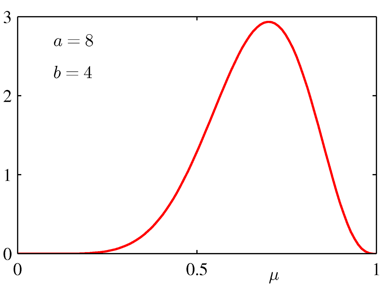 앞서 이항 분포에서 *MLE* 를 통해 얻어진 $ \mu $ 의 값이 샘플 평균임을 확인했다. ( $ \mu = \bar{x} $) 문제는 샘플 결과에 의존적이기 때문에 동전 던지기의 경우 만약 샘플의 결과가 모두 앞면이 나오면 $ \mu=1 $ 이 되어 오버피팅의 결과를 얻게 된다. 이제 이 문제를 확장하여 기존의 *MLE*가 아닌 베이지안 방식으로 파라미터를 추정하는 것을 살펴볼 것이다. 그 과정에서 필요하는 부분이 바로 파라미터의 사전(prior) 확률 값 $ p(\mu) $ 을 구하는 것이다. 중요한 점은 $ p(\mu) $ 를 도입하되 여기서 $ \mu $ 는 랜덤 변수로 고려되게 된다. 말이 좀 이상하긴 한데 확률 함수의 주 변수는 원래 랜덤 변수이다. *MLE* 에서는 파라미터를 고정된 값이지만 알지 못하는 값으로 규정하고 이를 추정하는 문제로 해결했었다. 전통적인 통계학에서는 이러한 방식의 한계점을 넘기 위해 구간 추정의 방식을 도입한다. 즉, 파라미터를 하나의 값으로 추정하는 것이 아니라 어떤 범위 내에 존재하는 값으로 추정한다. 얼핏 베이지언 방식과 비슷할 것 같지만 파라미터의 사전 확률 분포가 도입되는 것은 아니다. 반면 베이지안 방식에서는 파라미터를 랜덤 변수로 고려하여 일반적인 확률 분포로 다루게 된다. 그런데 무작정 사용할 파라미터를 랜덤 변수로 취급한다고 해서 모든 문제가 해결되는 것은 아니다. 지금까지 살펴보았듯 가급적 이 값을 하나의 확률 분포로 고려를 했으면 하는데 파라미터에 대한 분포는 과연 어떤 분포를 가지는게 좋을까? 동전 던지기 문제에서는 가능도 함수의 형태가 $ \mu $ 와 $ (1-\mu) $ 의 지수의 곱으로 표현되고 있었다. 그리고 베이지안 방식에 에서는 가능도 함수 값을 최대로 하는 파라미터 값을 구하는 문제가 아니라, 사후 분포(posterior)를 최대화하는 문제로 풀게 된다. 이 때 사후 분포는 가능도 함수로 유추된 $ p(x\|\mu) $ 와 이 때의 $ p(\mu) $ 사전 분포의 곱에 비례한다. $$ p(\mu \| x) \propto p(x\|\mu)p(\mu) $$ 사후 분포는 확률 분포이다. 따라서 우리가 알고 있는 일반적인 분포의 형태로 만들어야 계산이 편하다. (예를 들면 정규분포, 이항분포 등) 사전 분포도 확률 분포이다. 따라서 사전 확률 분포를 도입하되 이것 또한 우리가 알고 있는 분포로 만들어야 계산이 편하다. 물론 실제로는 파라미터의 사전 분포 $ p(\mu) $ 가 실제 어떤 분포를 따라야 하는지는 사실 알아내기가 어렵다. 근데 앞서 이야기한 대로 사전 분포도 쉬운 꼴로 되어 있어야 하고, 이에 가능도 함수를 곱한 것도 쉬운 분포 꼴로 나와야 한다. 이런 경우 사후 분포와 사전 분포를 같은 분포의 형태로 만들어 사용하면 어떨까? 이러면 전체적으로 계산이 쉬워질 것이다. 간혹 가능도 함수까지 유사한 분포 형태로 맞출수도 있다. 즉, 여기서는 $ \mu $ 와 $ (1-\mu) $ 의 지수의 곱 형태로 표현하는 것이다. 이렇게 되면 사후 분포(posterior) 는 $ \mu $ 와 $ (1-\mu) $ 의 지수의 곱으로 표현될 것이고, 필연적으로 사전 분포도 이런 형태로 만들어져야 한다. 결국 사용되는 사전 분포와 사후 분포의 형태가 같아진다. 이러한 속성을 공액(conjugacy)이라고 한다. 여기서는 어떤 확률 분포들의 곱이 앞서 사용된 분포와 동일한 분포의 형태를 가지는 것을 의미하게 된다. 사실 특별한 이유에서 분포를 고른다기보다 계산의 편리함이 우선시되는 방식이다. (즉, 마구잡이식 방법이다.) 베이지언 방식에서는 사전 확률 분포와 사후 확률 분포의 형태를 동일하게 가져가는 방식을 취한다. 이런 이유에서 지금 소개할 베타 분포(Beta distribution)가 매우 유용하게 사용된다. 이항 분포의 형태를 취하는 가능도 함수를 사용하는 경우 사전 확률로 베타 분포를 사용하면 베타 분포의 사후 확률을 얻을 수 있다. 이는 이항 분포와 베타 분포가 서로 공액적 관계에 놓여있는 분포들이기 때문이다. 즉, (베타분포 $ = $ 이항분포 $ \times $ 베타분포) 와 같은 형태의 식을 얻을 수 있다. 베타 분포는 다음과 같다. $$Beta(\mu|a, b) = \frac{\Gamma(a+b)}{\Gamma(a)\;\Gamma(b)}\mu^{a-1}(1-\mu)^{b-1} \qquad{(2.13)}$$