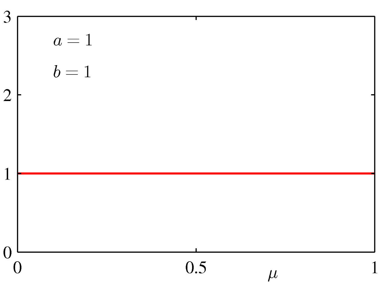 여기에 사용된 감마(Gamma) 함수는 다음과 같다. (이 함수는 감마 분포에서도 사용된다.) $$\Gamma(x)=\int_{0}^{\infty}u^{x-1}e^{-u}du$$ 베타 분포의 기본적인 성질은 다음과 같다. $$\int_{0}^{1}Beta(\mu|a,b)d\mu=1 \qquad{(2.14)}$$ $$E[\mu] = \dfrac{a}{a+b} \qquad{(2.15)}$$ $$var[\mu] = \dfrac{ab}{(a+b)^2(a+b+1)} \qquad{(2.16)}$$ 식에서 사용된 베타 분포는 앞서 설명한 이항 분포의 공액 분포를 설명하는 것으로, 주 변수는 바로 이항 분포의 $ u $ 가 된다. 따라서 이 베타 분포의 모수 a, b는 초모수(hyper-paramter) 또는 하이퍼-파라미터라고 부른다. 모수(paramter)의 모수(paramter) 이므로 하이퍼(hyper)를 붙인다. 하이퍼-하이퍼-파라미터가 존재하는지 궁금하다면? 웃길것 같지만 존재하는 개념이며 계속 확장 가능함 그냥 지나치기 서운하므로 베타 분포의 모양을 좀 살펴보자.