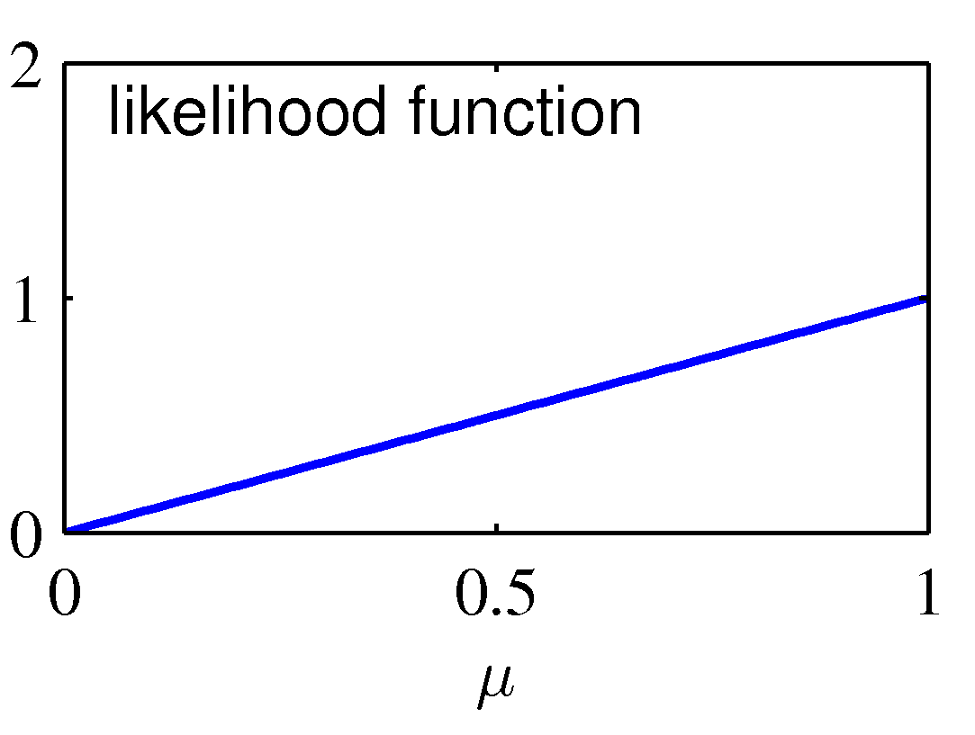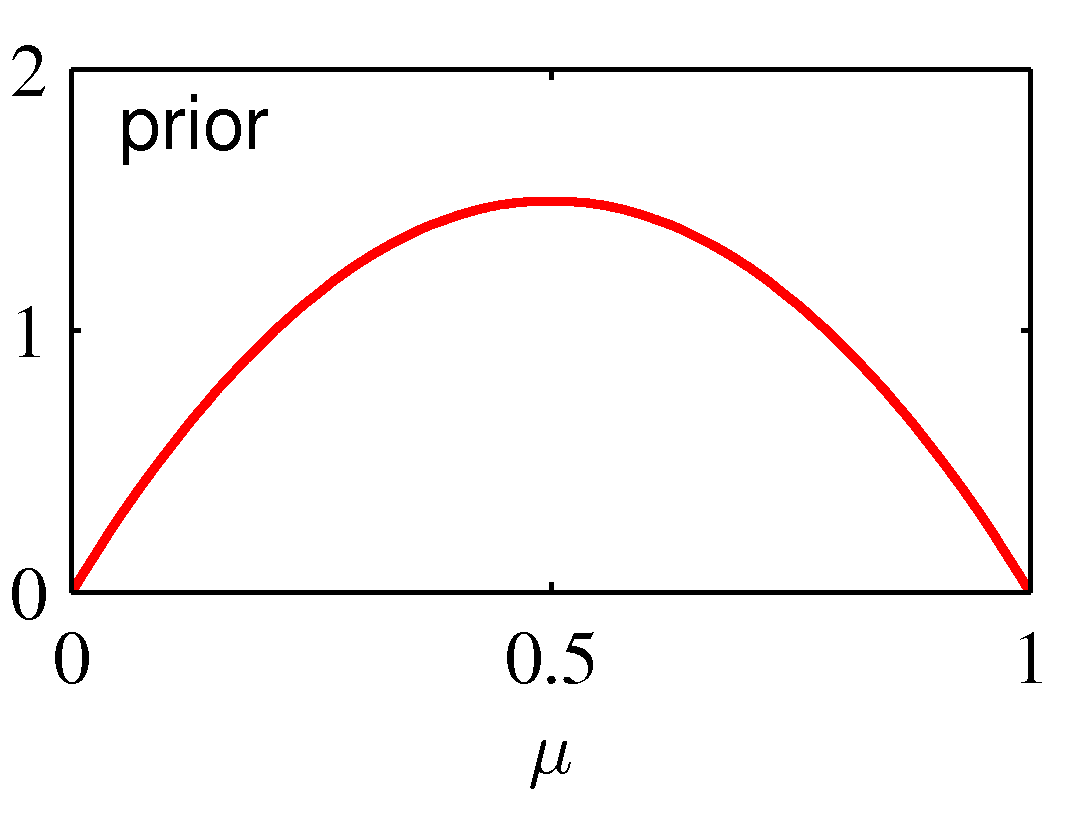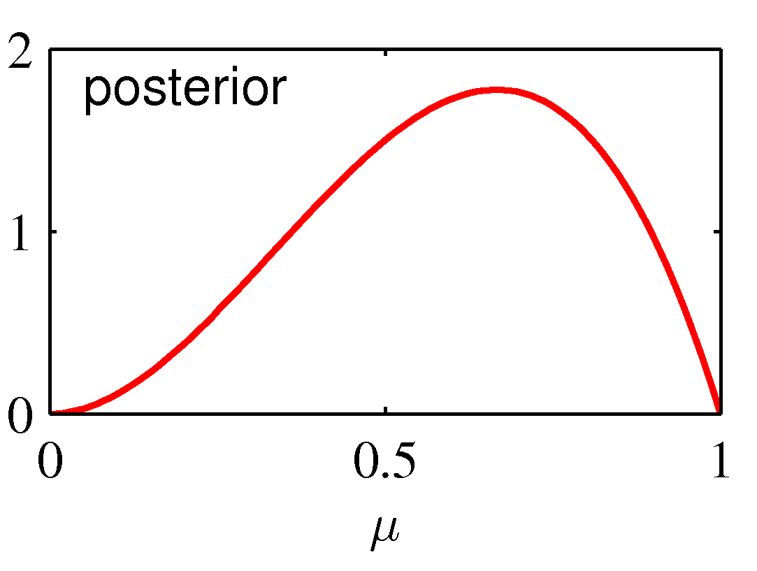 위의 그림은 연속된 베이즈 추론의 예로, 사전 분포로 베타 분포의 모수 값이 $ a=2 $ , $ b=2 $ 이 주어졌다. 실제 발생한 사건은 1건으로 앞면이 나왔다. 이 경우 $ N=m=1 $ 이 되고 이를 모수에 관한 그림으로 표현하면 중간 그림이 된다. 최종 얻어지는 사후 확률은 맨 오른쪽이 된다. 실제 발생한 사건은 동전의 앞면이 나온 한 가지 사건이지만, 사전 분포의 영향으로 사후 분포의 모양이 사전 분포와 비슷하게 만들어지게 된다. 물론 앞면이 한번 나왔기 때문에 $ \mu=1 $ 쪽으로 약간 치우치게 된다.