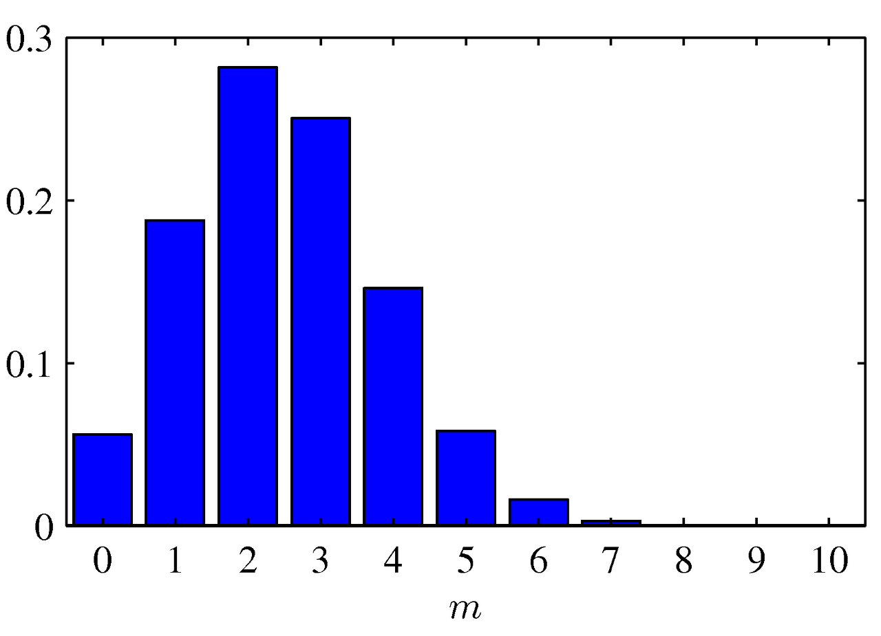 자 이제 이러한 추정 방식의 문제점을 살펴보자. 만약 동전을 3번 던졌는데 앞면만 3번이 나왔다면 MLE는 어떻게 될까? 이 때에는 $ \mu=1 $이 되며 앞으로 동전을 던졌을 때에는 무조건 앞면만 나온다고 판단하게 된다. 물론 이런 가정이 맞을 수도 있지만 (뭐, 앞면만 그려진 동전일 수도 있으니...) 일반적인 상황에서는 대개 틀린 결과이다. 이런 경우를 오버피팅(over-fitting)되었다고 판단한다. 원래 *MLE* 방식은 관찰 데이터에 의해 오버피팅 되는 경향이 있다. 이후에는 $ \mu $ 에 대해 사전(*prior*) 분포를 도입해서 이런 문제(오버피팅)를 해결할 것이다. 이제 문제를 살짝 바꿔서 동전 던지기를 $ N $ 번 수행해서 앞면이 총 몇개가 나왔는지를 판단하는 문제를 고려해보자. 이런 분포를 **이항 분포**(*binomial distribution*)라고 부른다. 베르누이와 이항 분포의 차이를 기억하자.