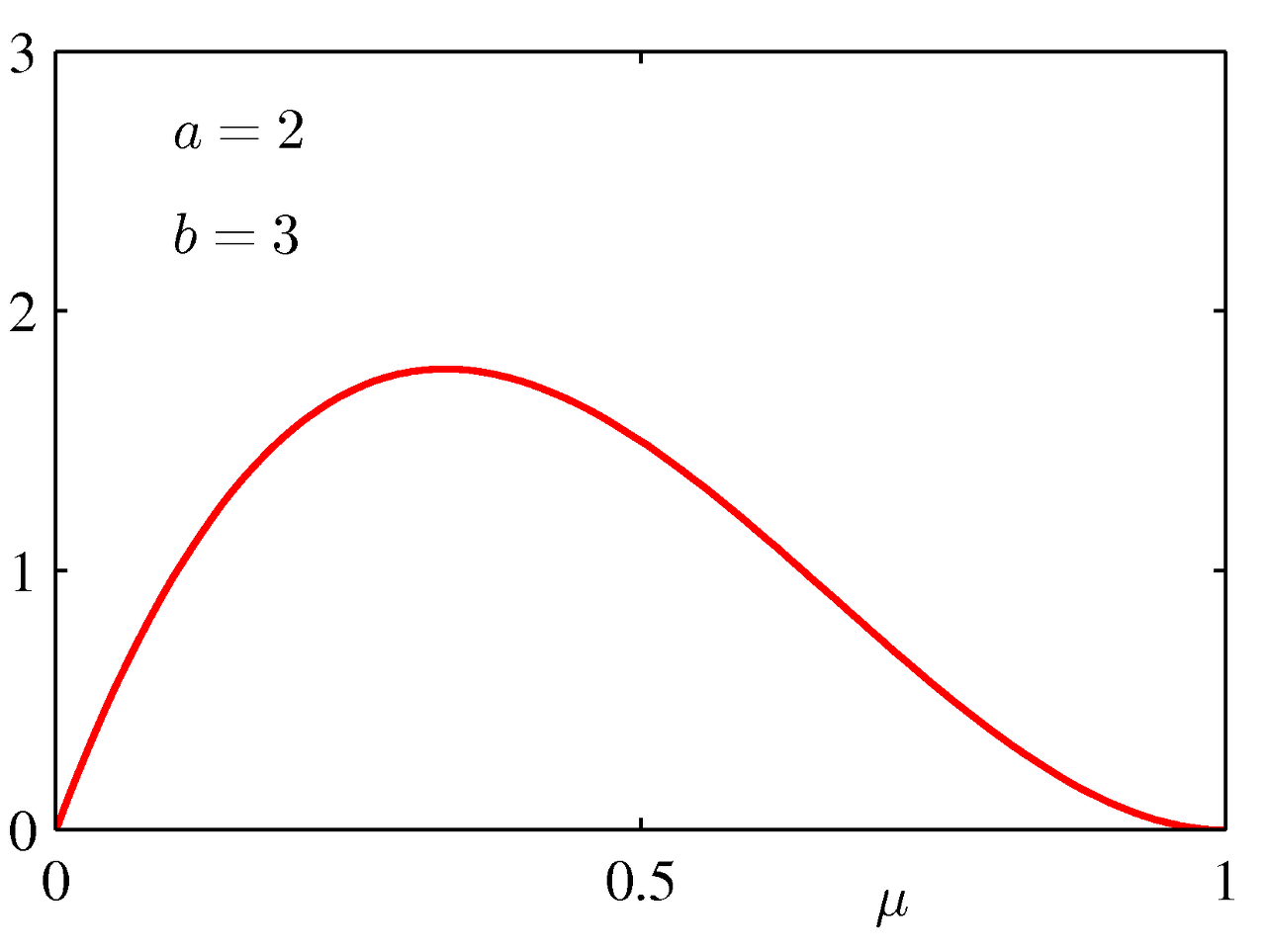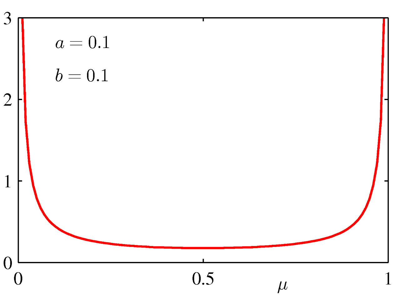 여기에 사용된 감마(Gamma) 함수는 다음과 같다. (이 함수는 감마 분포에서도 사용된다.) $$\Gamma(x)=\int_{0}^{\infty}u^{x-1}e^{-u}du$$ 베타 분포의 기본적인 성질은 다음과 같다. $$\int_{0}^{1}Beta(\mu|a,b)d\mu=1 \qquad{(2.14)}$$ $$E[\mu] = \dfrac{a}{a+b} \qquad{(2.15)}$$ $$var[\mu] = \dfrac{ab}{(a+b)^2(a+b+1)} \qquad{(2.16)}$$ 식에서 사용된 베타 분포는 앞서 설명한 이항 분포의 공액 분포를 설명하는 것으로, 주 변수는 바로 이항 분포의 $ u $ 가 된다. 따라서 이 베타 분포의 모수 a, b는 초모수(hyper-paramter) 또는 하이퍼-파라미터라고 부른다. 모수(paramter)의 모수(paramter) 이므로 하이퍼(hyper)를 붙인다. 하이퍼-하이퍼-파라미터가 존재하는지 궁금하다면? 웃길것 같지만 존재하는 개념이며 계속 확장 가능함 그냥 지나치기 서운하므로 베타 분포의 모양을 좀 살펴보자.