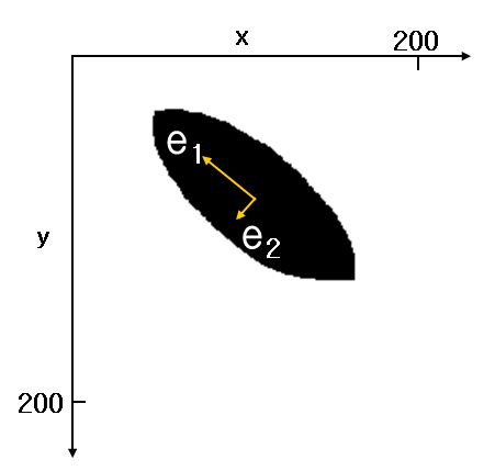 PCA는 분포된 데이터들의 주성분(Principal Component)를 찾아주는 방법이다. 좀더 구체적으로 보면 아래 그림과 같이 2차원 좌표평면에 n개의 점 데이터 (x1,y1), (x2,y2), ..., (xn,yn)들이 타원형으로 분포되어 있을 때