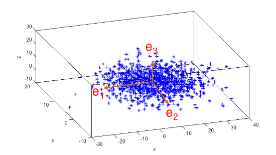이 데이터들의 분포 특성을 2개의 벡터로 가장 잘 설명할 수 있는 방법은 무엇일까? 그건 바로, 그림에서와 같이 e1, e2 두 개의 벡터로 데이터 분포를 설명하는 것이다. e1의 방향과 크기, 그리고 e2의 방향과 크기를 알면 이 데이터 분포가 어떤 형태인지를 가장 단순하면서도 효과적으로 파악할 수 있다. PCA는 데이터 하나 하나에 대한 성분을 분석하는 것이 아니라, 여러 데이터들이 모여 하나의 분포를 이룰 때 이 분포의 주 성분을 분석해 주는 방법이다. 여기서 주성분이라 함은 그 방향으로 데이터들의 분산이 가장 큰 방향벡터를 의미한다. 위 그림에서 e1 방향을 따라 데이터들의 분산(흩어진 정도)이 가장 크다. 그리고 e1에 수직이면서 그 다음으로 데이터들의 분산이 가장 큰 방향은 e2이다. PCA는 2차원 데이터 집합에 대해 PCA를 수행하면 2개의 서로 수직인 주성분 벡터를 반환하고, 3차원 점들에 대해 PCA를 수행하면 3개의 서로 수직인 주성분 벡터들을 반환한다. 예를 들어 3차원 데이터의 경우는 위 그림과 같이 3개의 서로 수직인 주성분 벡터를 찾아준다.