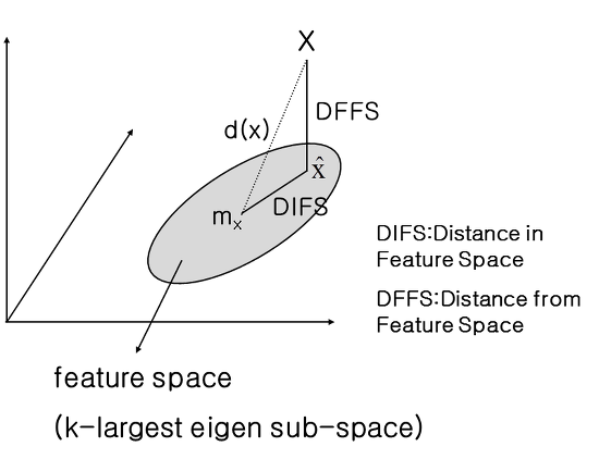 PCA를 얼굴검출에 응용하기 위해서는 먼저 수많은(최소 1,000개 이상) 얼굴 샘플들을 모아서 eigenface들을 구한 후 얼굴로서 의미가 있다고 생각되는 전반부 k개의 eigenface들만을 선택한다. 이후 테스트할 입력 영상(윈도우 영역) x가 들어오면 x를 k개의 eigenface들만을 이용하여 복원(reconstruction) 했을 때 원래 영상 x와 얼마나 가까운지를 살펴본다. 만일 x가 k개의 eigenface를 조합해서 완벽히 근사된다면 x는 얼굴일 확률이 매우 높다. 또 하나의 판단 기준은 이렇게 근사된 xk가 평균적인 얼굴(average face)과 얼마나 가까운가이다. x가 아무리 eigenface들로 근사가 잘 되어도 실제 평균 face와 동떨어져 있다면 face로 보기 힘들다. 따라서, x에 대한 최종 판단은 얼마나 근사가 잘 되는지와 근사된 얼굴이 실제 얼굴 이미지 평균과 얼마나 차이가 있는지를 종합적으로 고려하여 판단한다. 이러한 두 평가기준의 차이를 그림으로 나타내면 아래 그림과 같다. 그림에서 DFFS는 얼마나 근사가 잘 되는지를 나타내고 DIFS는 근사된 얼굴이 얼굴 평균과 얼마나 가까운지를 나타낸다.