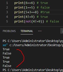 또 python에서는 참과 거짓을 구별할 수 있다고 했는데요 이를 booln이라고 말합니다. 대소 관계 말고 ==는 같다는 의미와!=는 같지 않다를 이용해서 참/거짓이 나옵니다. 또 중간에 연산을 넣어도 계산된 값과 비교를 해서 참/거짓이 나옵니다.