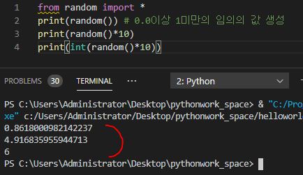 >print(int(random()*10)+1) # 1 이상 10 이하의 임의의 값 생성