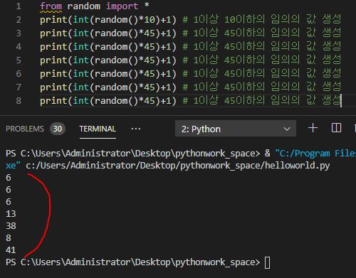 >print(int(random()*45)+1) # 1 이상 45 이하의 임의의 값 생성