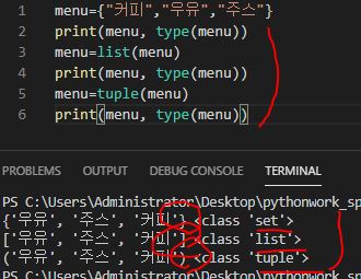 지금까지 배운 세 가지 타입을 변경할 수 있어요 예를 들어 menu라는 집합을 set의 기호인 중괄호 { }로 묶어서 선언을 해주면 python은 이를 set로 인식을 합니다. 이것을 list로 변경을 할 수 있고 tuple로도 변경을 할 수 있습니다.