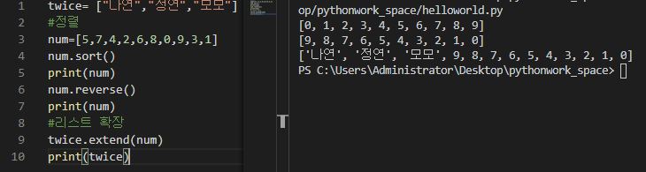 리스트는 순서가 있으므로 숫자일 경우 오름차순, 내림차순으로 정렬도 가능합니다. sort()를 이용하면 기본적으로 작은 것부터 큰 순서대로 정렬이 되고 reverse()를 사용하면 반대가 됩니다. 또 두 리스트를 통합할 수도 있습니다. 앞 예제의 트와이스와 숫자 리스트의 통합은 extend()를 사용하면 됩니다.