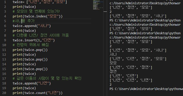 이렇게요. 잠깐의 복습으로 이때 모모가 몇 번로 줄을 서고 있는 알기 위해서는 앞 포스팅에서 했던 index를 활용하면 됩니다. print(twice.index("모모")) 이런 식으로 하면 되겠죠? 모르시면 이전 포스팅 공부하고 오세요. 이 리스트에 트와이스 멤버를 추가해보겠습니다. 사나를 추가해 보죠. append()를 이용하면 list 마지막에 추가를 시킬 수가 있고 중간에 멤버를 추가하고 싶으면 insert()를 사용하면 됩니다. 중간에 추가시키려면 넣고자 하는 위치 번호를 입력해주어야 합니다.