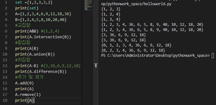 이렇게 명령을 주면 출력은 {1,3,2}가 나옵니다. 세트는 수학에서 집합과 동일하다고 생각하면 됩니다. 그래서 집합 연산이 가능하죠. 만약에 집합 A={x|x는 36의 약수}={1,2,3,4,6,9,12,18,36}, B={x|x는 40의 약수}={1,2,4,5,8,10,20,40}를 선언을 하고 교집합과 합집합을 구해보겠습니다. 교집합은 intersection, 간단히 기호로 &, 합집합은 union, |로 표현합니다.