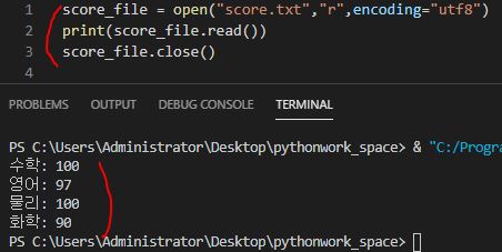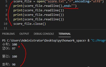 만약 한 줄씩 읽고 싶으면 score_file.readline()와 같이 line을 뒤에 붙여주면 됩니다. 우리는 4줄이 입력되어 있는 것을 알고 있기 때문에 print를 4번 사용해서 각 줄의 데이터를 읽을 수 있습니다.