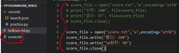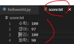 score_file.close()를 사용해서 open 한 파일은 항상 닫아주어야 하는데 with를 사용하면 더 간편하게 파일을 읽고 쓸 수가 있습니다.