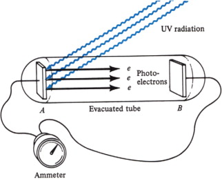 금속판에 특정 진동수 이상의 진동수를 가진 빛을 쪼여 주었을 때 금속판 안에 있던 전자들이 튀어나오는 현상을 광전 효과(photoelectric effect)라고 합니다. 자유 전자들이 있는 금속에 빛을 비추면 빛의 알갱이가 전자에 부딪쳐서 전자를 튕겨내는 것입니다. 이때 튀어나온 전자를 광전자(photoelecron)라고 합니다. 금속에서 광전자가 튀어나오게 하기 위해서는 금속에 비추는 빛의 진동수가 특정 진동수보다 커야 합니다. 즉, 금속에 비춘 빛의 진동수가 특정한 값보다 작으면 센 빛을 오랫동안 비추어도 전자는 튀어나오지 않습니다. 이때의 진동수를 문턱 진동수라고 합니다. 아무리 세기가 약한 빛이라도 그 진동수가 문턱 진동수보다 크면 시간 지연 없이 광전자가 바로 튀어나옵니다. 따라서 광전자의 운동 에너지는 빛의 세기에는 관계없고 빛의 진동수에 관계가 있습니다. 하지만 같은 진동수의 빛을 쪼일 경우에 튀어나오는 광전자의 수, 즉 광전류의 세기는 빛의 세기에 비례합니다.