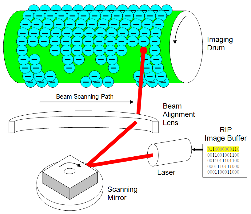 복사기는 토너 가루가 글자가 있는 부분에 붙어 글자를 표시하는 방식으로 광전 효과 및 정전기 유도 현상을 이용한 대표적인 기구 중 하나입니다. 절연된 드럼을 (+) 전하로 대전시키고 드럼 표면에는 빛을 받으면 도체가 되는 물질이 칠해져 있습니다 따라서 드럼이 빛을 받으면 드럼으로부터 전자가 이동하여 빛을 받는 부분은 중성이 됩니다. 원본에서 나온 빛 중 검은색 글자에서 반사된 빛은 드럼의 (+)전하를 그대로 두지만 나머지 부분은 전자를 방출하게 되어 (+)전하를 띤 부분을 중성으로 만듭니다. (-)전하를 띤 작은 토너 가루들이 드럼의 (+)전하를 띤 부분에 붙습니다. 이 부분은 글자의 이미지가 새겨진 부분입니다. 글자가 새겨질 종이는 (+)전하로 대전되어 있어 드럼에 새겨진 토너 가루를 끌어당겨 종이에 붙게 됩니다. 최종적으로 종이가 뜨거운 롤러 사이를 지나면서 토너 가루가 녹아 종이에 완전히 붙게 됩니다.