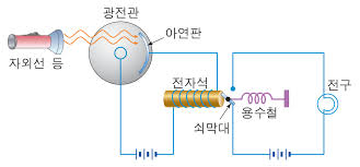 핸드폰이 밝은 곳이나 어두운 곳에서 밝기가 자동으로 조절되는 원리가 광전 효과입니다. 빛이 광전관에 부딪치면 전자가 방출되어 감도 높은 전류계에 검출되며 이 전류의 크기는 빛의 세기에 따르므로 전류의 세기에 다라 자동적으로 조명도를 맞추게 되는 것입니다. 또 도난 경보기에는 광전관을 비추는 빛이 눈에 보이지 않게 하기 위해서 가시광선보다 자외선을 흔히 사용합니다. 빛을 광전관의 음극관에 비추면 광전류가 발생하여 전자석의 코일에 전류가 흐르므로 스위치의 금속 막대를 끌어당겨서 스위치를 열어 놓습니다. 만약 침입자가 지나가면서 빛을 차단하면 광전류가 흐르지 않게 되어 전자석이 자성을 잃게 되므로 용수철이 금속 막대를 오른쪽으로 잡아당겨 스위치를 닫습니다. 이때 경보 시스템이 작동하여 경보음이 울리게 됩니다.
