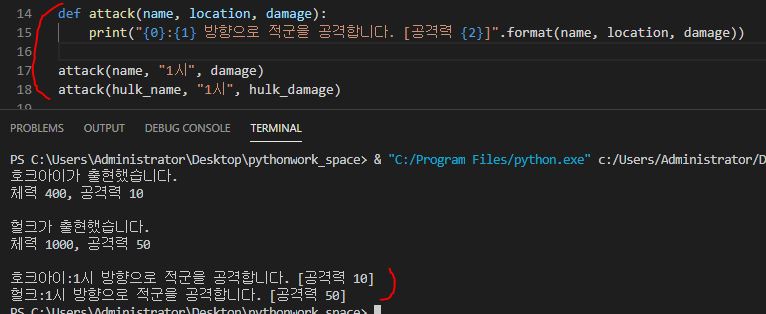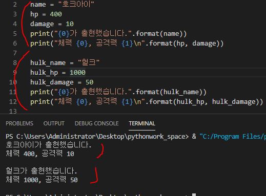 print("체력 {0}, 공격력 {1}\n".format(hp, damage))