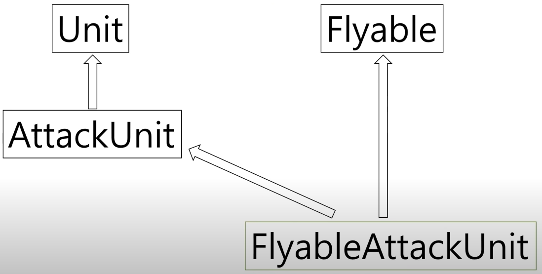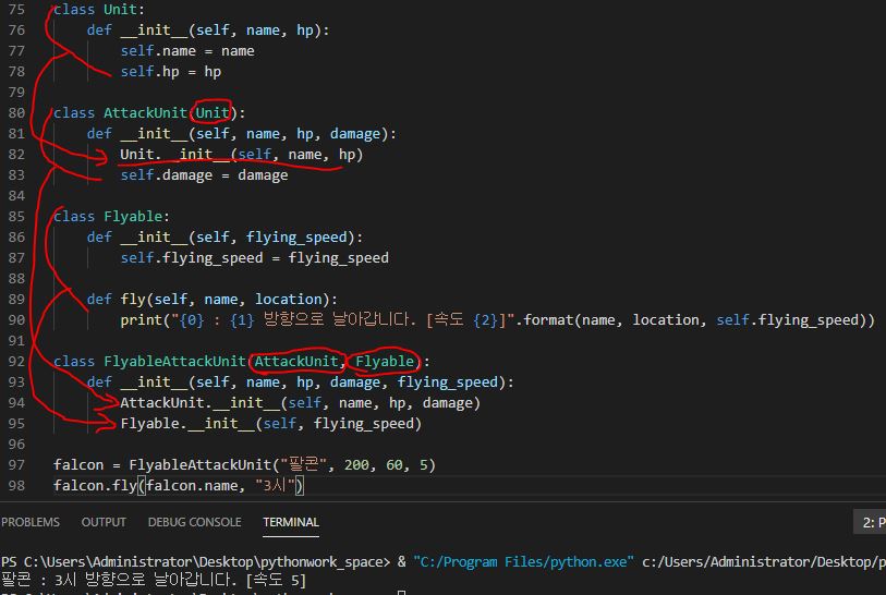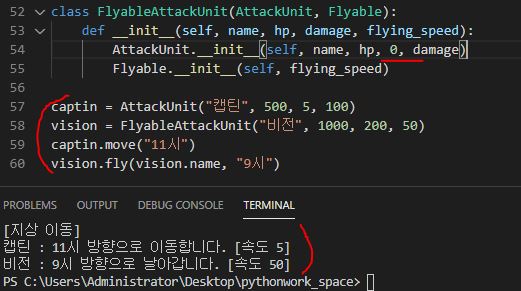 보시면 AttackUnit이라는 class에 이전 Unit class를 불러와서 추가가 되었습니다. 즉, AttackUnit은 Unit을 포함하게 된것입니다. 이후 공중을 날 수 있는 히어로를 부르기 위해 Flyable이라는 class를 만들고 FlyableAttackUnit로 연결시켜보겠습니다.