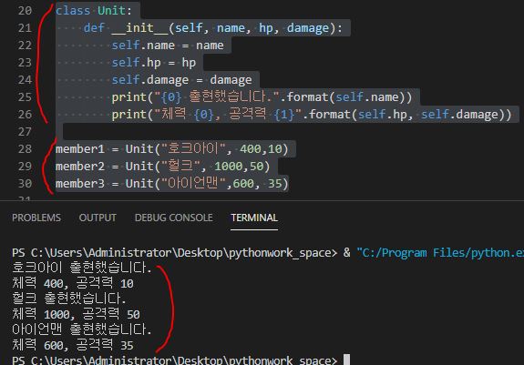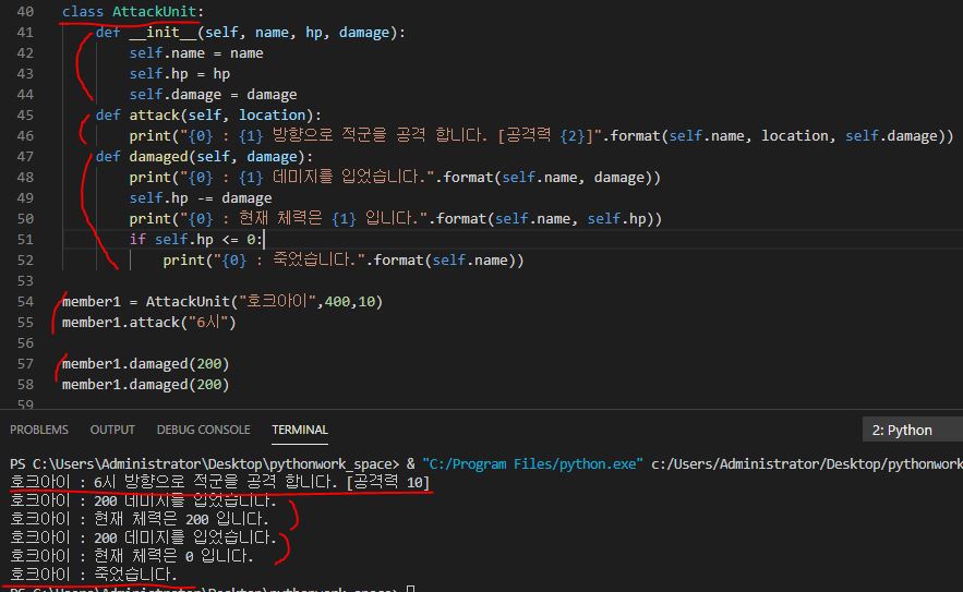이렇게 멤버의 번호를 붙이고 각 멤버의 고유한 이름과 체력, 공격력 정보를 넣음으로써 관리하기가 편리해지는 것입니다. class 다음에 class의 이름을 만들어 주고 def로 함수를 선언한 뒤 두 번의 under bar+init+두 번의 under bar는 초기화를 시켜준다고 생각하면 됩니다. class를 선언한 뒤 객체를 생성한다고 보면 됩니다. self는 반드시 넣어주고 멤버의 변수를 원하는 만큼 넣습니다.