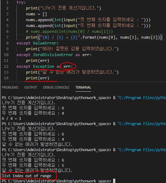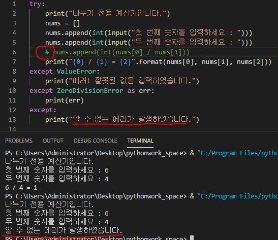 nums로 빈 리스트를 만들고 append를 활용해서 입력받은 두 개의 num과 연산으로 생성되는 num을 넣었습니다. 만약 여기서 주석처리(#)를 활용해서 세 번째 num을 비활성화하여 실행을 하면 에러가 발생합니다. ValueError도 아니고 ZeroDivisionError도 아닙니다. 이처럼 아무런 에러가 아닐 때는 다음을 작성해 주면 됩니다.