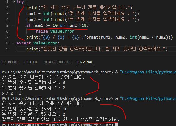 if문을 사용해서 num1 또는 num2가 10 이상이면 ValueError를 활성시키라는 의미입니다. 실행을 시켜 10 이상의 숫자를 입력하면 에러 문장이 표현되는 것을 확인할 수 있습니다.