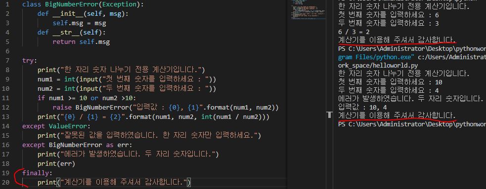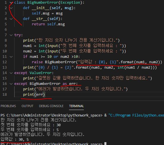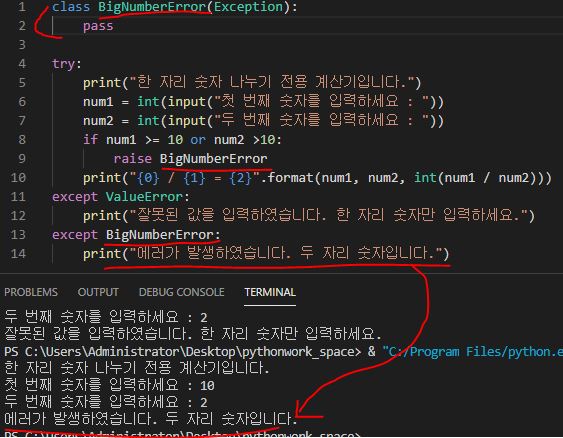 BigNumberError라는 class를 만들어 주고 if문 안에 있는 ValueError를 BigNumberError으로 바꿔줍니다. except BigNumberError를 추가하여 에러 문장을 작성해 주면 에러 발생 시 해당 문장을 출력해줍니다.