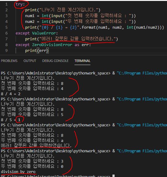num이라는 변수에 input명령어를 사용해서 사용자로부터 숫자 정보를 받습니다. 파이썬에서 input은 모두 문자 형태로 받아들이므로 int를 사용해서 input을 감싸주었습니다. 그럼 python에서는 input으로 받은 내용을 정수 형태로 읽어 들입니다. 8 나누기 4를 하면 2가 계산되고 8 나누기 5를 하면 1.6이 아니라 1이 출력이 됩니다. 왜냐하면 int(num1/num2) 때문이죠 int는 정수이기 때문에 소수점이 버리고 정수만 표시를 합니다. 여하튼 잘 계산이 되는 것을 확인할 수 있습니다. 여기에 우리는 일부러 에러를 발생해 보겠습니다. input으로 숫자가 아닌 문자를 입력하면 연산을 할 수 없기 때문에 에러가 발생이 되고 또 두 번째 input에 0을 입력하면 나누기 에러가 발생하겠죠? (0으로 나눌 수 없기 때문에) 그럴 경우 우리가 원하는 방법으로 에러를 표현할 수 있습니다. 저는 "에러! 잘못된 값을 입력하였습니다."로 표현을 해 보겠습니다.