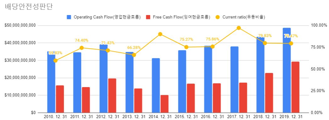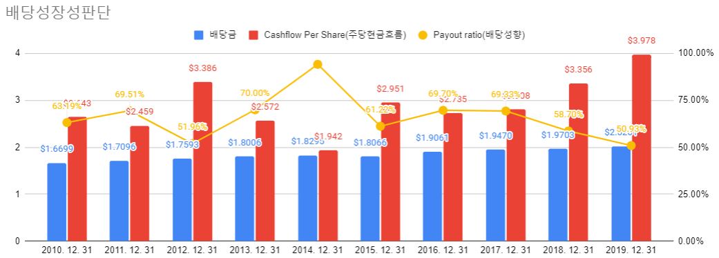 저는 배당성장성을 주당 현금흐름으로 파악을 합니다. 이 기업이 한 주당 얼마나 여유 있는 현금을 만들어내고 있는지 알 수 있고 배당금이 적정 수준에서 들어오고 있다는 것을 확인할 수 있기 때문입니다. 배당금이 주당 현금흐름보다 많다고 하면 말이 안 되겠죠? 배당을 줄 형편이 안되는데 억지로 배당을 지급하다가는 기업이 폭망 할 수 있기 때문입니다. 고작 배당금 얼마 받자고 투자금을 잃을 수는 없지 않겠어요? 또 배당성향이 60%대에 있는 것은 아주 바람직한 배당주라는 것을 의미하기 때문에 그래프에 추가하였습니다.