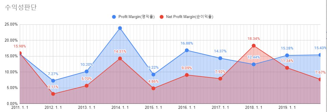 최근 십 년간 AT&T 매출을 보면 꾸준히 우상향 하는 것을 확인할 수 있습니다. 영업이익과 순이익도 변화가 있었지만 평균적으로 상향하고 있는 것을 확인할 수 있습니다. 경영을 잘하고 있고 앞으로도 성장할 가능성이 있다고 판단할 수 있겠죠? 다른 방법으로 수익률을 보는 방법도 있습니다. 영업이익률과 순이익률을 보면 매출액을 보지 않아도 기업의 안전성을 판별할 수 있습니다