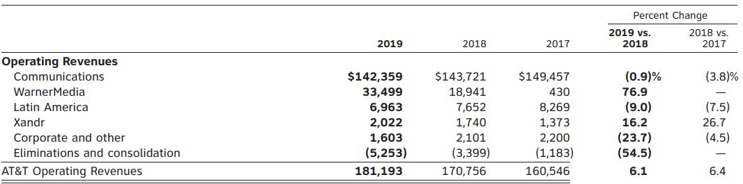 통신 기업답게 작년 총매출 181,193백만 달러 중 communication에서 142,359백만 달러로 매출의 대부분을 차지하고 있습니다. 그밖에 Warner Media와 Latin America 등에서 매출을 내고 있네요. AT&T는 ABO max를 인수하면서 미디어 쪽에 사업을 확장시키려고 하고 있습니다. Latin America는 멕스코에서 통신서비스를 제공하는 것 같은데 비중이 많지 않아 넘어가겠습니다. 여하튼 주요 매출이 통신과 미디어에서 나온다고만 보고 넘어가겠습니다.