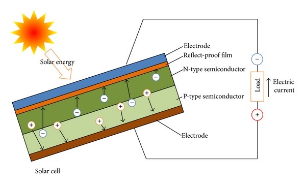 태양 전지는 빛 에너지를 이용하여 직접 전기를 생산하는 반도체 소자입니다. 태양 전지에 반도체 띠틈보다 큰 에너지의 빛을 비추면 원자가 띠의 전자가 전도띠로 전이하고, 이에 따라 양공과 전자가 생성됩니다. p-n 접합부에 형성된 전기장에 의해 전자는 n형 반도체 쪽으로, 양공은 p형 반도체 쪽으로 모이게 되어 p-n 반도체 사이에 기전력(전압)이 생기게 됩니다. 이때 두 반도체 양 끝에 외부 전선을 연결하면 이 전자가 외부 회로를 따라 이동합니다. 이 외부 회로에 전기 기구를 연결하면 태양 전지에 햇빛을 비추는 동안 계속 전류가 흘러 작동하게 됩니다.
