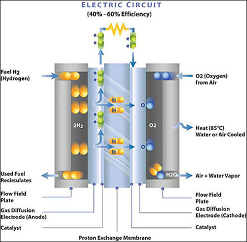 (-) 극에서는 수소 분자가 전자를 내놓고 수소 이온으로 변하는 산화 반응이 일어나고, (+) 극에서는 산소 분자가 전자를 받아들이고 수소 이온과 결합하는 환원 반응이 일어납니다. 이 과정에서 물이 생성되고, 전자가 외부 전선을 통해 이동하므로 전류가 흐르게 됩니다. 연료로는 순수한 수소 이외에 수소 원자가 포함된 화석 연료도 가능합니다. 그리고 산화물로 산소 이외에 산소가 포함된 대기 중의 공기를 사용하여도 됩니다. 이때 전극은 촉매 역할을 합니다.