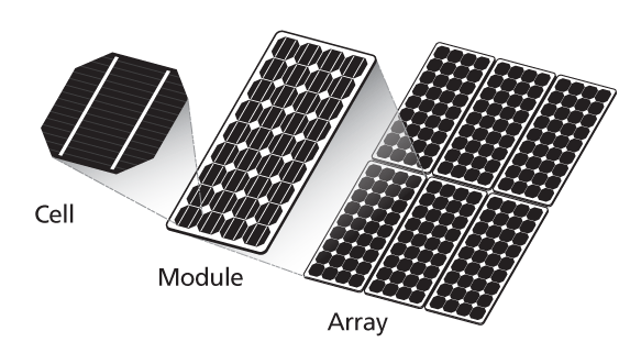 태양 전지의 효율은 보통 10% 내외지만 최근 기술이 발달하고 다양한 형태의 태양 전지들이 개발되면서 20% 이상의 효율을 가진 것들도 개발되고 있습니다. 전기를 생산할 수 있는 가장 작은 크기의 태양 전지를 셀(cell)이라고 하는데, 이 셀들을 일정한 크기로 연결한 것을 모듈(module)이라고 합니다. 이 모듈을 직렬 또는 병렬로 연결한 것을 어레이(array)라고 합니다. 이러한 어레이를 넓은 지역에 설치하여 용량이 큰 전기 에너지를 생산하는 것이 태양광 발전입니다.