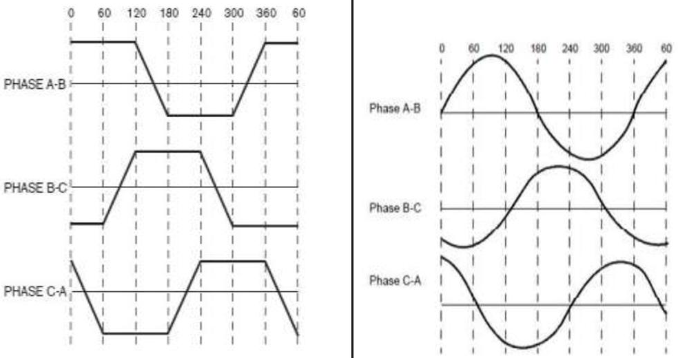 | 제어방식 | 간편한 제어(6개 사다리꼴 상태) 정류 시 토크 리플 저속에서 더욱 뛰어남 잡음 있음 분배 와인딩에서 작동하지 않음 낮은 토크에서 비효율적 낮은 비용 |