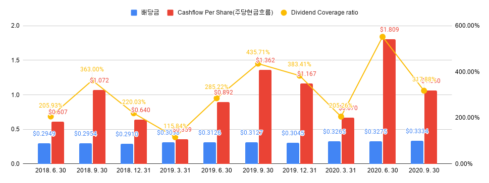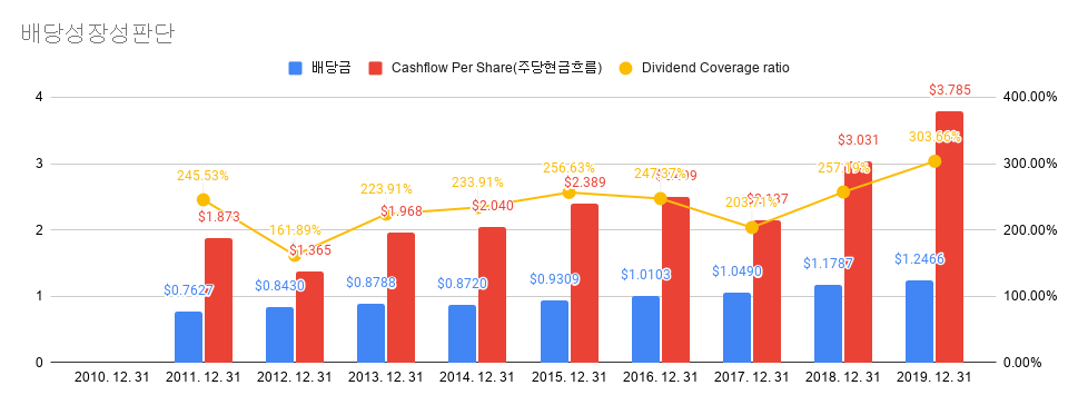 그다음은 배당 성장성을 파악해 보겠습니다. 10년 전에 비해 배당은 2배 가까이 오른 것을 확인할 수 있습니다. 주당 현금흐름이 배당보다 많이 있기 때문에 향후에 배당금을 늘릴 여력이 있다는 것을 확인할 수 있습니다. 약 3배 이상의 현금흐름을 가지고 있으니 지금처럼만 유지된다고 하면 매년 배당이 늘어가는 것을 기대할 수 있을 듯합니다.