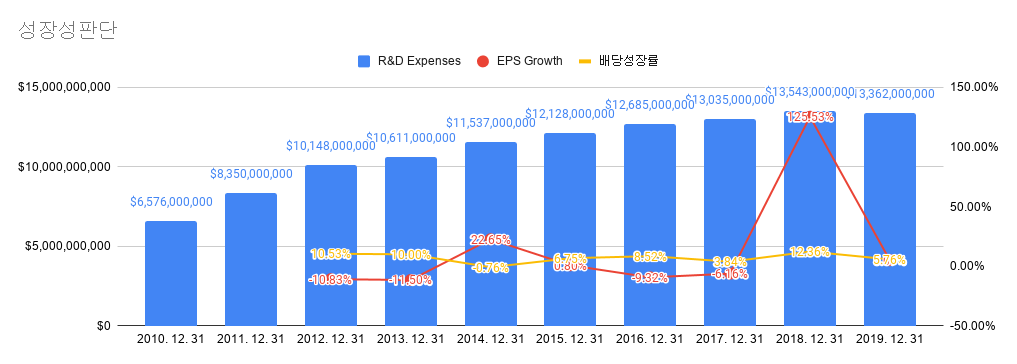 인텔은 IT기업이기 때문에 R&D 비용을 추가하였습니다. 새로운 반도체를 연구하고 개발하기 위해서 투자를 얼마나 하고 있는지 봐야하겠죠? R&D에 많은 투자를 하고 있으면 아무래도 신기술 출시가 앞당겨지고 매출이 올라 성장할 수 있는 기반이 마련될 것입니다. 지난 10년간 인텔은 약 2배 정도 R&D에 많은 투자를 하고 있습니다. 주당 수익률은 14년도와 18년도에 확 증가한 것을 확인할 수 있습니다. 아무래도 새 CUP가 출시되면 주가가 증가를 하는 구도인 것 같네요