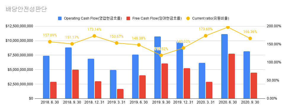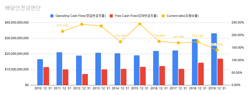 다음은 배당을 안전적으로 주는지 살펴보겠습니다. 유동비율은 약 170%정도 확보를 하고 있네요 잉여 현금 흐름도 일정한 비율로 가지고 있는 것을 확인할 수 있습니다. 잉여현금흐름이 있다는 것은 주주들에게 안전적으로 배당을 지급 하고 있다고 볼 수 있겠습니다.