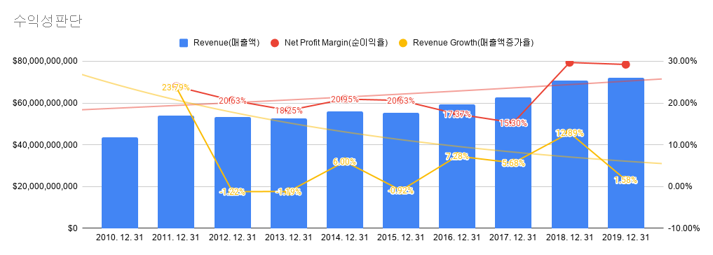 지난 10년간 매출은 꾸준히 증가해왔습니다. 10년도에 약 4.4천만 달러를 기록했었는데 19년도에는 7천만 달라를 찍었습니다. 순이익도 매년 15% 이상 내고 있으니 오래된 기업인 만큼 안전한 기업 운영을 보여 주고 있네요. 하지만 수익성만 보고 성장을 가늠할 순 없습니다. 다음은 성장성을 보도록 하겠습니다.