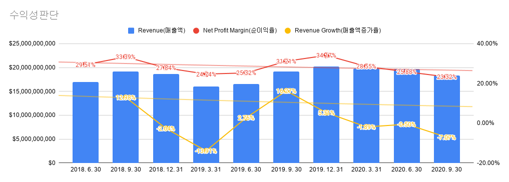 최근 3년간은 매출의 변화가 거의 없었습니다. 오히려 배출이 소폭 감소를 했습니다. 하지만 순 이익은 25% 이상 유지를 하고 있네요 아무래도 지난 3년 동안 새 CPU 개발이 없어 이러한 매출 변화를 보여주는 것이 아닌가 싶습니다. 올해 코로나의 영향과 차세대 CPU 개발의 지연 발표로 매출이 감소한 영향이 있는 것 같습니다.